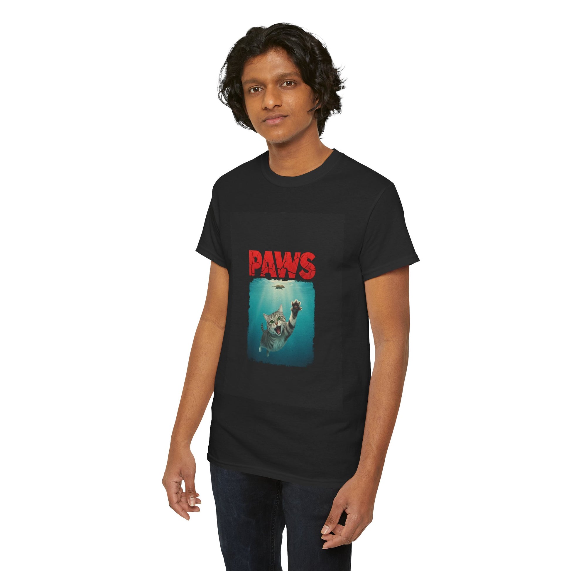 This soft, classic-fit tee channels tongue-in-cheek nostalgia with a bold central print: a playful parody graphic that mixes summer beach-horror vibes and goofy feline mischief. The image sits slightly distressed against the shirt’s dark field, giving it a worn-in, lived-with look that slips easily into everyday rotation. Wear it to grab laughs at a weekend hangout, to lighten up a movie night, or as a comfortable layering piece when the air chills. The shirt’s medium-weight cotton holds the print’s rich colors while staying breathable and durable through repeat wears and washes.