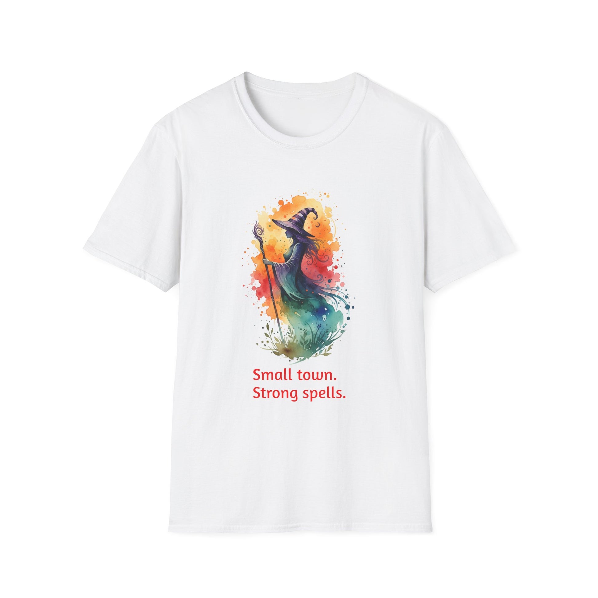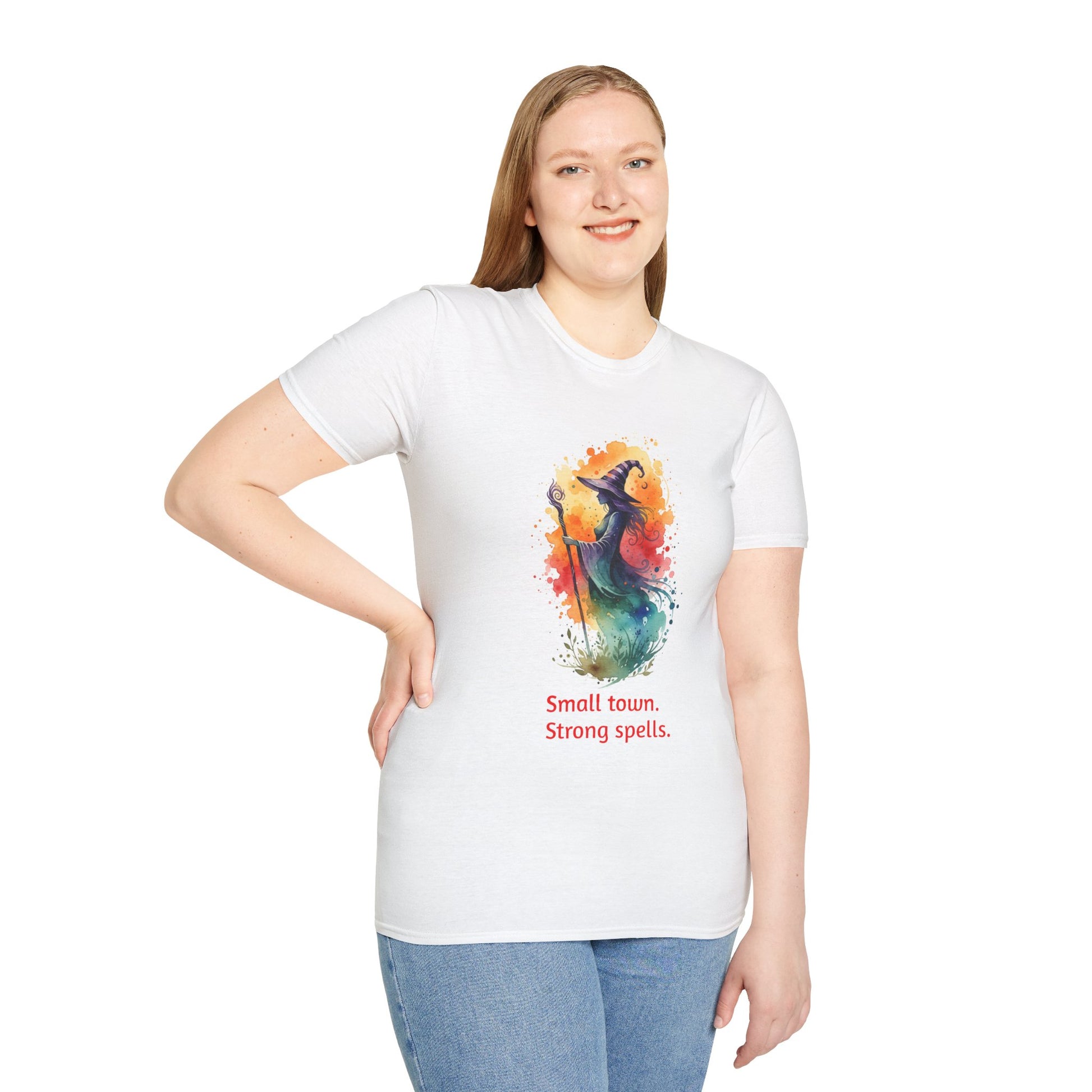 Lightweight, breathable, and artfully printed — this cotton tee brings a little magic into everyday wear. A watercolor-style witch silhouette bursts in warm oranges, deep teals, and ink-black splatters above the phrase “Small town. Strong spells.” with a subtle town name to the side. The classic crew neckline and clean, tubular knit create a smooth, unfussy silhouette that layers easily under jackets or stands alone with jeans. Wear it to local bookshop readings, moonlit walks, farmers’ markets, or cozy café afternoons to show quiet pride in small-town magic and community lore.